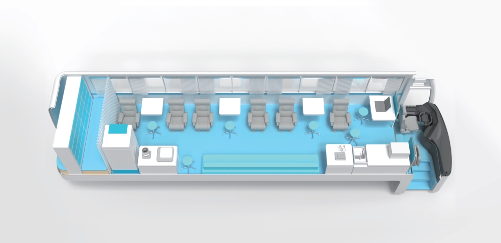 11大巴客車平臺(tái),車內(nèi)空間寬敞,搭載市電空調(diào),配備3個(gè)采血位和6個(gè)采血椅,配有微波爐、食品冰箱、飲水機(jī)等生活設(shè)施,設(shè)有應(yīng)急休息床,可最大限度保障獻(xiàn)血者的舒適度和人身安全。此外還可裝配拓展倉,拓寬車內(nèi)采血空間。