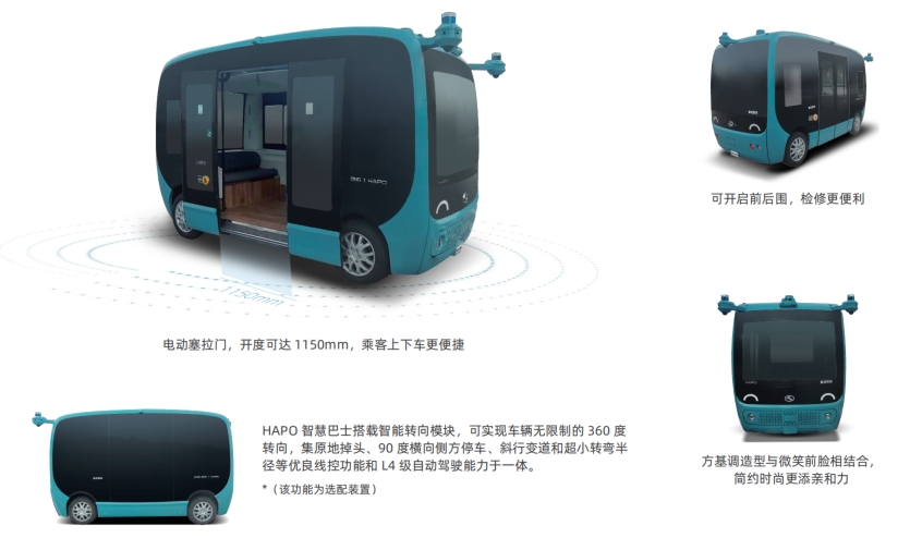 HAPO(HAPPY GO)智慧巴士起步于2017年,滿(mǎn)足目前國(guó)內(nèi)最高等級(jí)L4的智能駕駛需求,經(jīng)過(guò)數(shù)十萬(wàn)公里的市場(chǎng)檢驗(yàn),擁有成熟的量產(chǎn)運(yùn)營(yíng)經(jīng)驗(yàn)。HAPO智慧巴士搭載金龍自主研發(fā)的3.5T線控底盤(pán),更大的承載力滿(mǎn)足更多營(yíng)運(yùn)需求;萌動(dòng)靈巧的獨(dú)特造型、寬綽簡(jiǎn)約的內(nèi)飾風(fēng)格令美好深入人心。